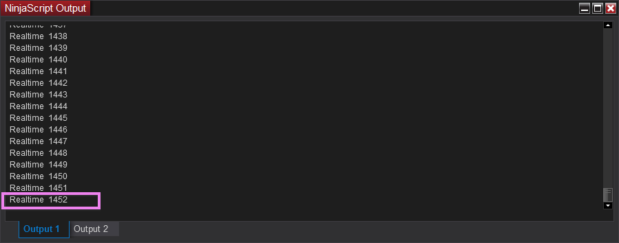 If I let the currently forming bar close, the strategy prints "Realtime 4581" to the Output window. If I let another bar close, the strategy prints "Realtime 4582" to the Output window.