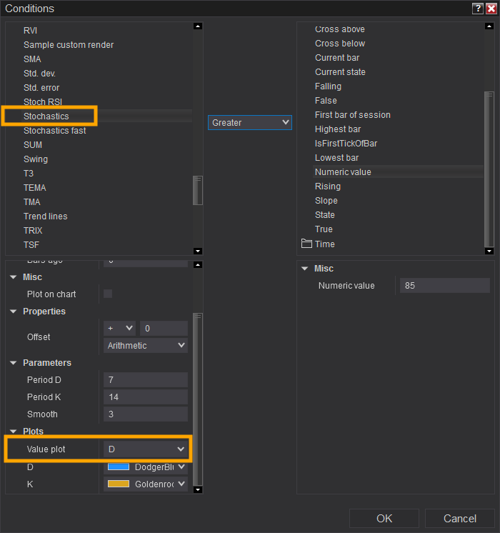 If so, you could open a New > Strategy Builder window, navigate to the Conditions and Actions screen, and set up a condition that checks if the previous Close price (Price folder > Close > Bars ago property > 1) is Greater/Less than the 'D' plot of the Stochastics indicator (Indicator folder > Stochastics > 'Value plot' drop-down property > 'D').