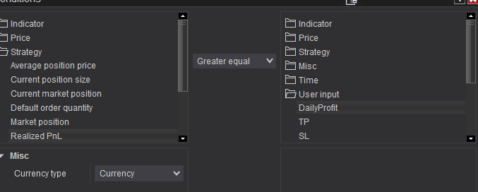 Hello all, me again. Coming across a new issue with one of my strategies. I have a daily profit target of $300 - $500 on the strategy. When it hits the desired profit it is supposed to check it against the realized profit and if it is >= to profit then it is supposed to stop entering. My issue is that when the profit is reached it takes another trade and then doesn't close it until the end of session which leads to catastrophic losses or gains. Attachments for some clarification. Any help appreciated.
