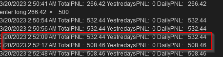 I see that you are printing out TotalPnL, YesterdaysPnL, and DailyPNL in your script. However, I do not see where you are printing out the DailyProfit value in your script to see if the DailyProfit value is less than DailyProfit.
