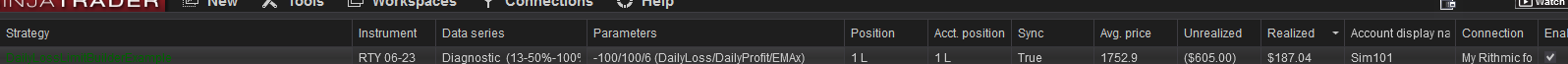 NinjaTrader_BrandonH Thanks for getting back to me and Im sorry it took me so long to get back. Is it possible to use prints in the builder? I am not a coder so I use the builder. Also, I tried using the DailyLossLimit example, I used the exact example and changed it from loss to profit and changed the example entry to a simple price cross, and it still takes trades after profit is reached. Could this be because it is a continuous strategy with no TP or SL? It just keeps flipping until it hits profit and then should stop. I will attach the strat in case it is needed. Attached is also a SS of the strat control panel. It hit $100 realized but still entered.