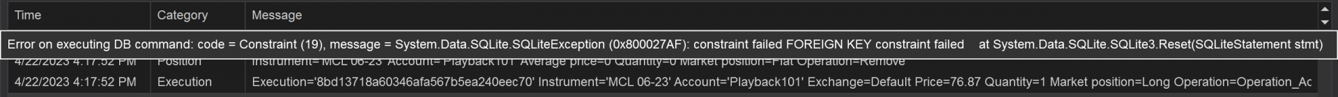 Right so then I had the market replay running along happily for about a week when it disabled itself. Ran it again. Blew up at the same place. There's a line in the log referring to a database issue: