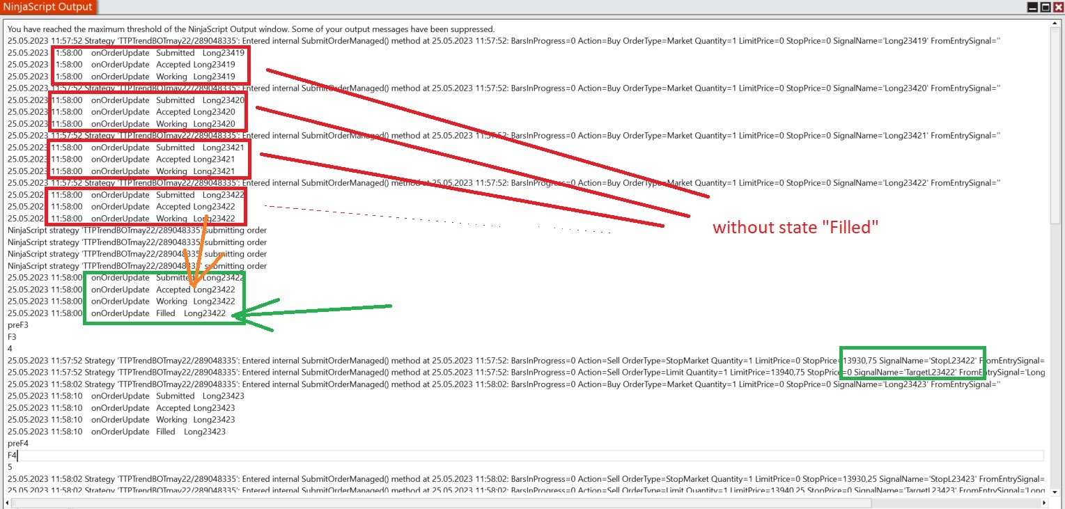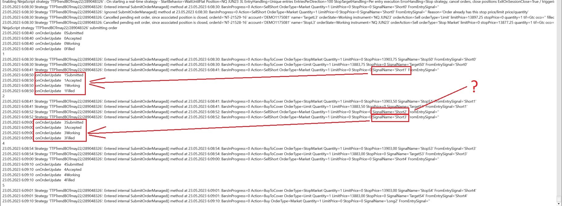 Hi, this would imply that your OnOrderUpdate method is not picking up that signal correctly. In the "OnOrderUpdate/OnExecutionUpdate" example, the entry order is detected in OnExecutionUpdate, and only the order reference is set in OnOrderUpdate.