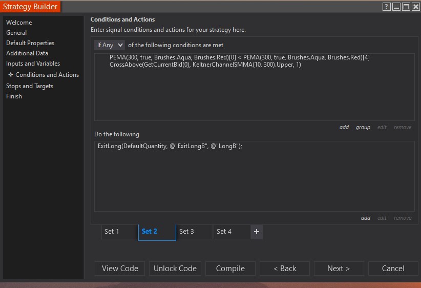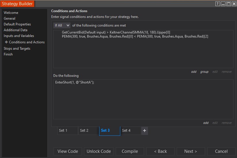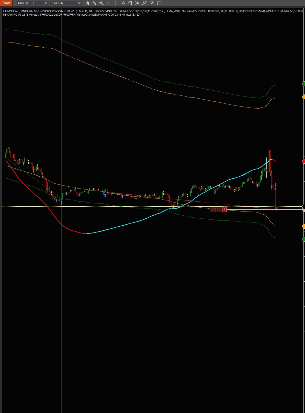 for context, Set 1 is for long entry, Set 2 is exiting Longs, and Set 4 is for exiting shorts MNQ6mA, and MNQ6mB are copies of one another, just set at different band settings.