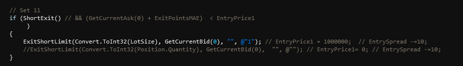 Same as the longs - the two code lines just above this sentence are the stop limit - to act as a stop for this trade, the code lines below are the target = once the target is triggered, I want a limit order to appear to exit the trade, however, it does not work like the longs logic does