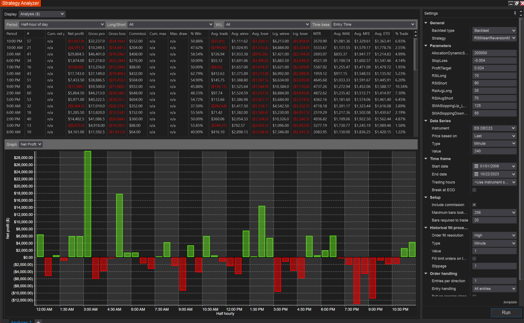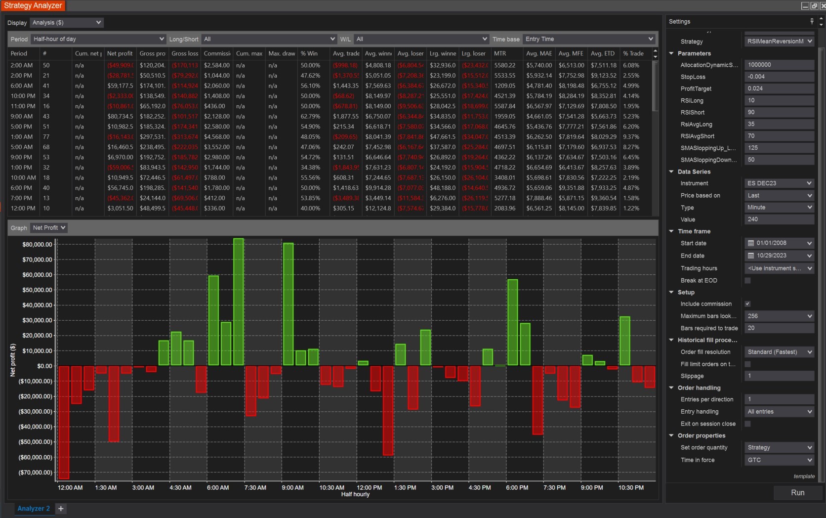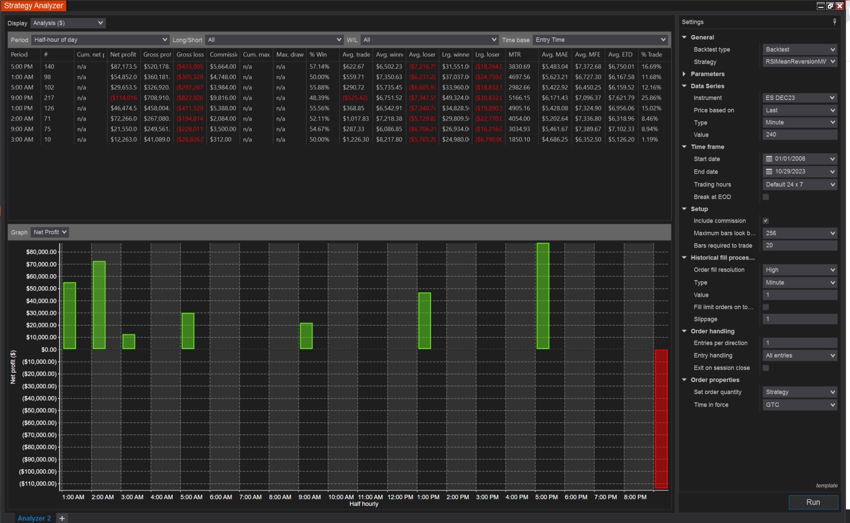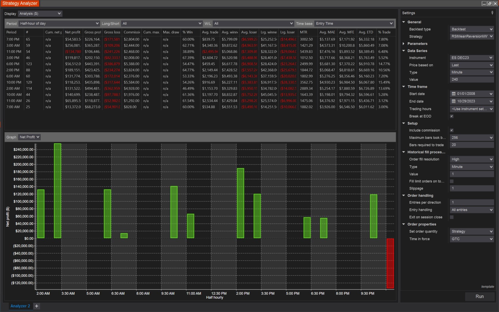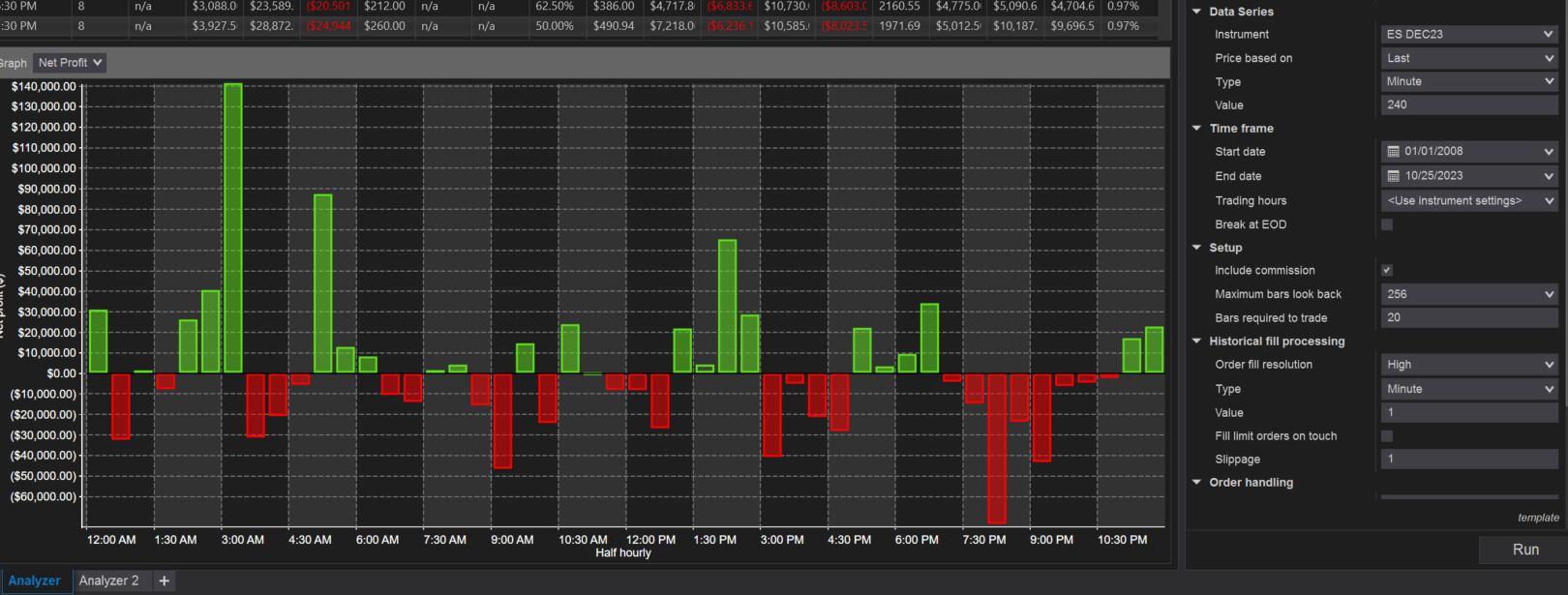 There is no halfs here or 30mins and even if there is.. there should be untraded gaps between the 4 hour candles.. in no scenario should i see entries on any half hour as i saw in the above result. When i check break EOD it behaves as expected and you can see trading gaps while 4 hour candle is forming gmind you when Break EOD is checked i saw on subsequent hours trade entries because market hours shift with daylight saving and thats correct) But when unchecked there are trades entering every 30mins? This leads ne to believe that left unchecked ninjatrader is skipping candles or randomizing the timing of the 240min candles open and close every day.. some kind of error.