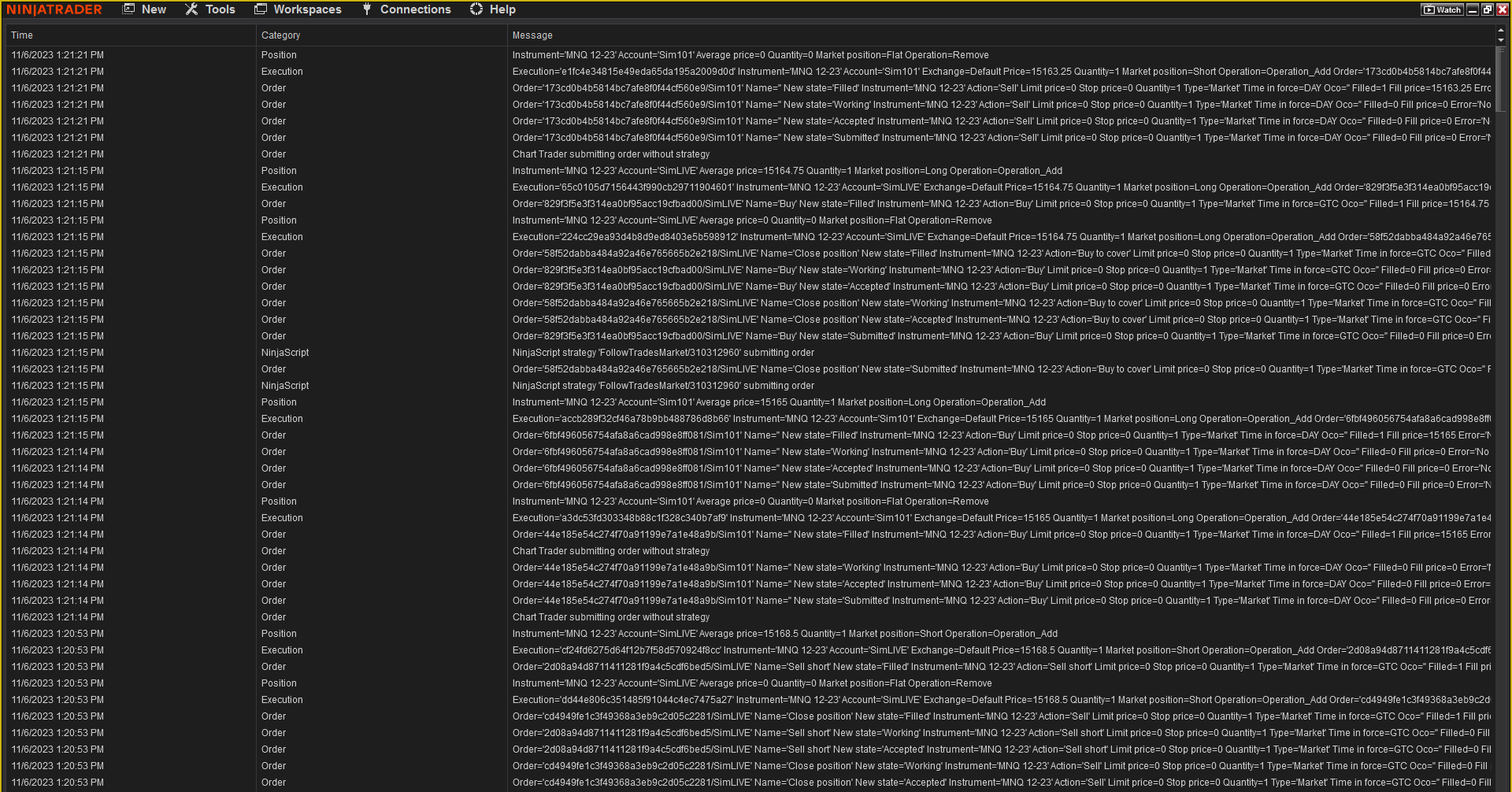11/6/2023 1:20:01 PM Strategy 'FollowTradesMarket/310312960': Entered internal SubmitOrderManaged() method at 11/6/2023 1:20:01 PM: BarsInProgress=0 Action=Buy OrderType=Market Quantity=1 LimitPrice=0 StopPrice=0 SignalName='' FromEntrySignal=''