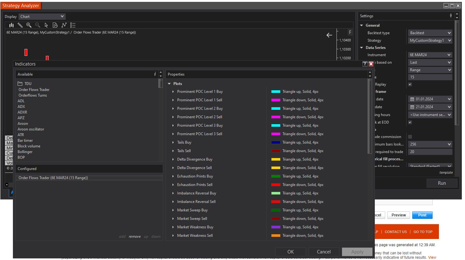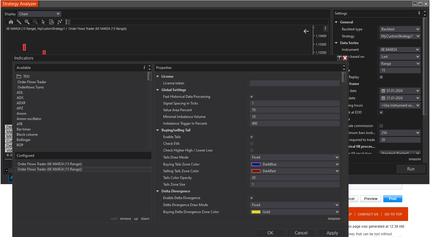 Hello guys. I want to create automated Strategy using 3rd party indicator. This indicator is Orderflows Trader. This indicator calculates signal conditions for example exhaustionPrintBuy. It looks like that.​ For example on ss1 we see that it generates values when it appears. I added it in Strategy Builder but when I try to analize strategy on Strategy Analyzer it seems indicator doesn't work on Chart on SA. (ss2). Also I observed that there are different properties beetween indicator added by Strategy Builder and manually added indicator (ss3 and ss4). Could anybody help me with handle a signal from any of built-in indicators within OrderflowsTrader on ExhaustionPrint example? Below I upload some SS and code.