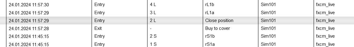 I have in my script Exitshort() before doing the enterlong when conditions are true. But there are more short positions closed than have been in the trade. Thats strange and cant find the reason.In the attached screenshot one can see that the short rS1a and rS1b from a trade and they are closed with Buy-To-Cover and Close Position. Where might this Close Position come from, is this maybe by default from NinjaTrader before doing a trade in the other direction?