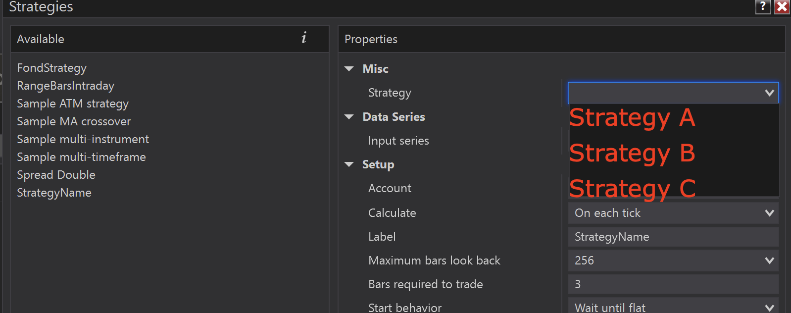 There will be 3 items in combobox in this case ( Strategy A, Strategy B, Strategy C). In this case will be default value Strategy A (see true parametr).