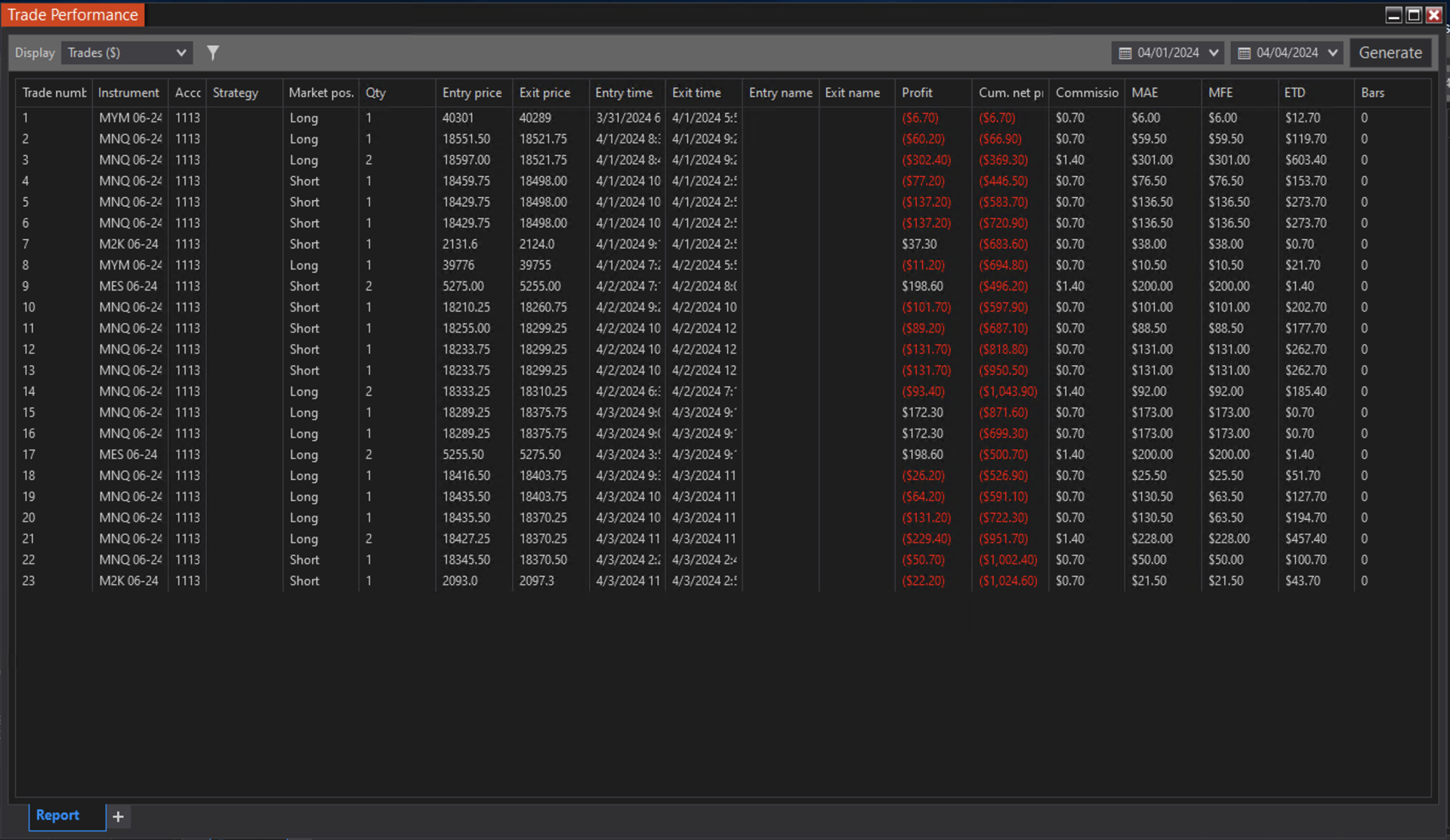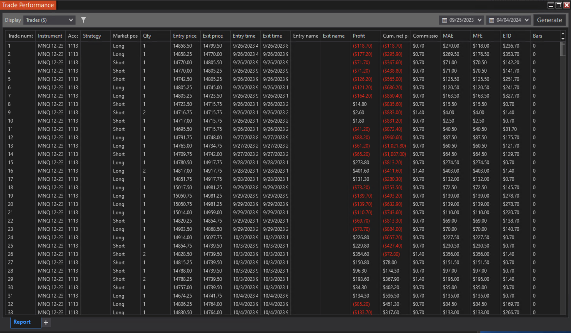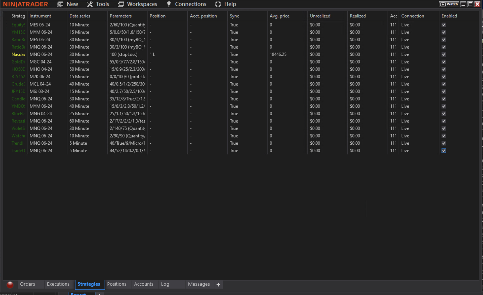 I'm running a portfolio of automated trading strategies that we have developed. About 17 or so at the moment. I want to export the live trade performance into Excel and do some modeling with the data. My problem is, the "Strategy" column is always blank. I want to know which strategy was responsible for which return so that we can do some interesting things and build out some portfolio modeling tools in Excel and python, but this seems to be fundamentally broken in NinjaTrader.