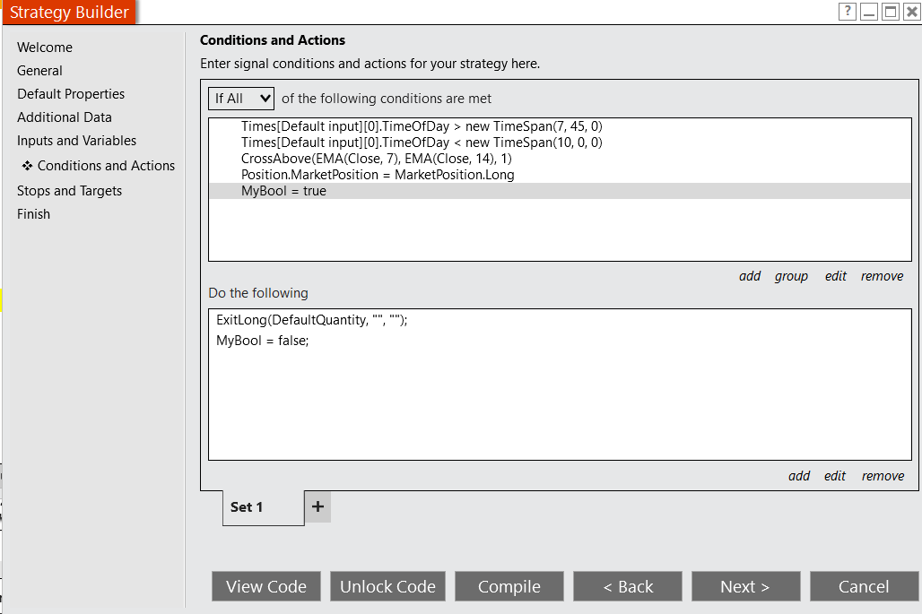 Then, in one of your sets (from the Conditions and Actions screen) you would have your time filter condition for the break, your crossover condition, and the additional checks for Market Position and the bool.