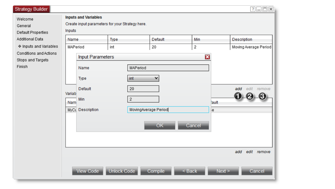 "The Inputs and Variables screen allows you to define the user inputs of your strategy. User inputs are important if you require input values that may vary the performance of your strategy. If for example you have a simple moving average cross over system, you may want to create an input for the fast moving average and another for the slow moving average"