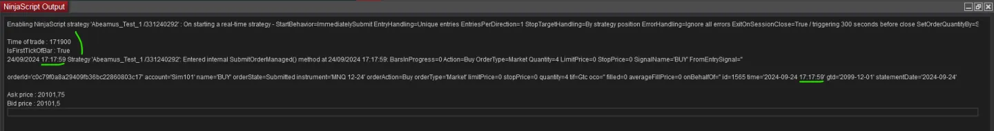 Prints will appear in the NinjaScript Output window (New > NinjaScript Output window).
