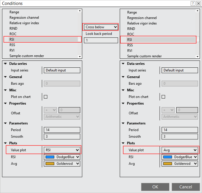 Attached is a screenshot of selecting RSI on the left and selecting the RSI plot, CrossBelow in the center, and RSI with the Avg plot selected on the right.