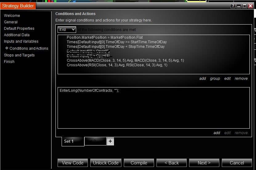 The best way to begin learning NinjaScript is to use the Strategy Builder. With the Strategy Builder you can setup conditions and variables and then see the generated code in the NinjaScript Editor by clicking the View Code button.