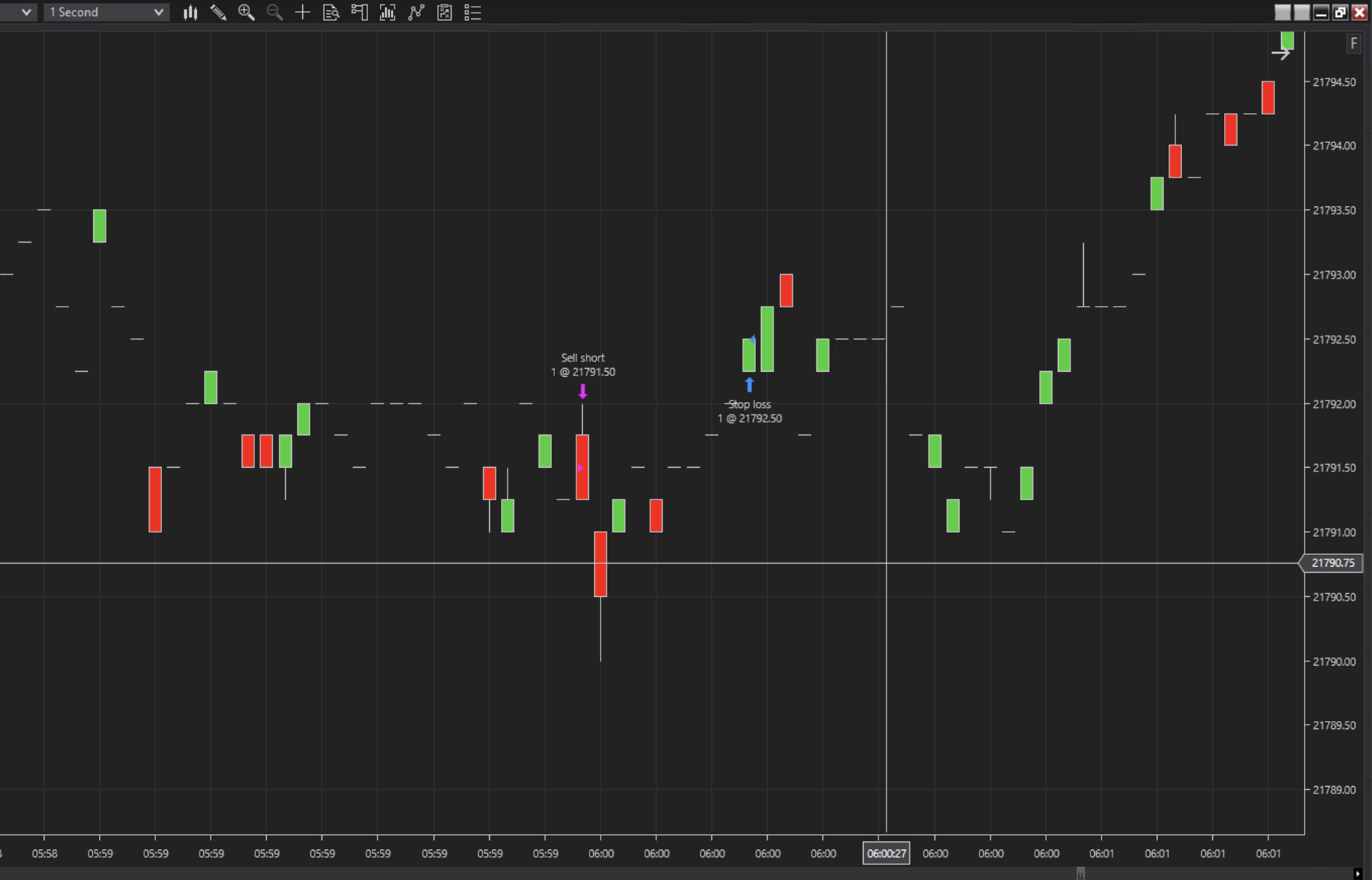 And if I switch the chart to 1-second intervals to see the details of what happened, I can see the prices from the previous images interacting: