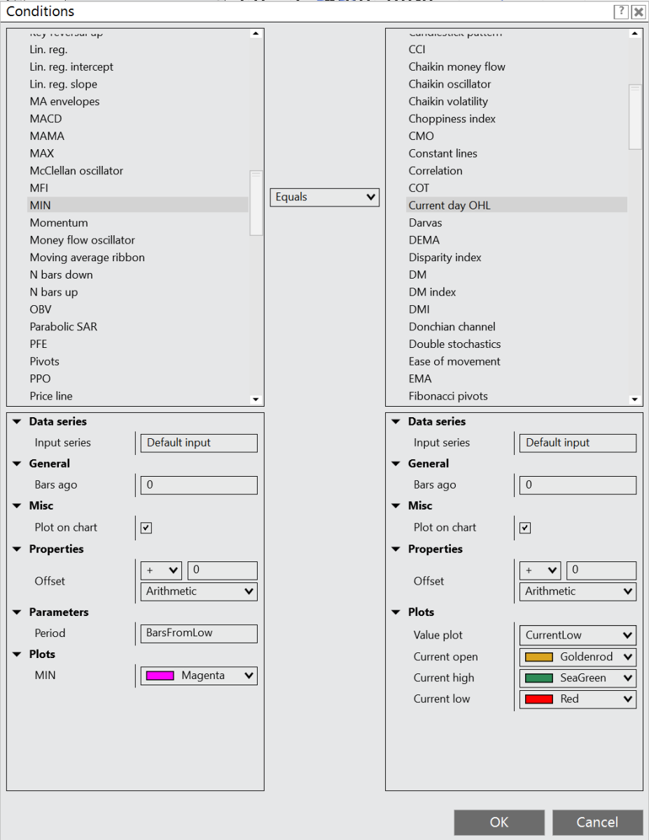 MIN indicator would return a value “equal to” the CurrentDayOHL indicator Current low