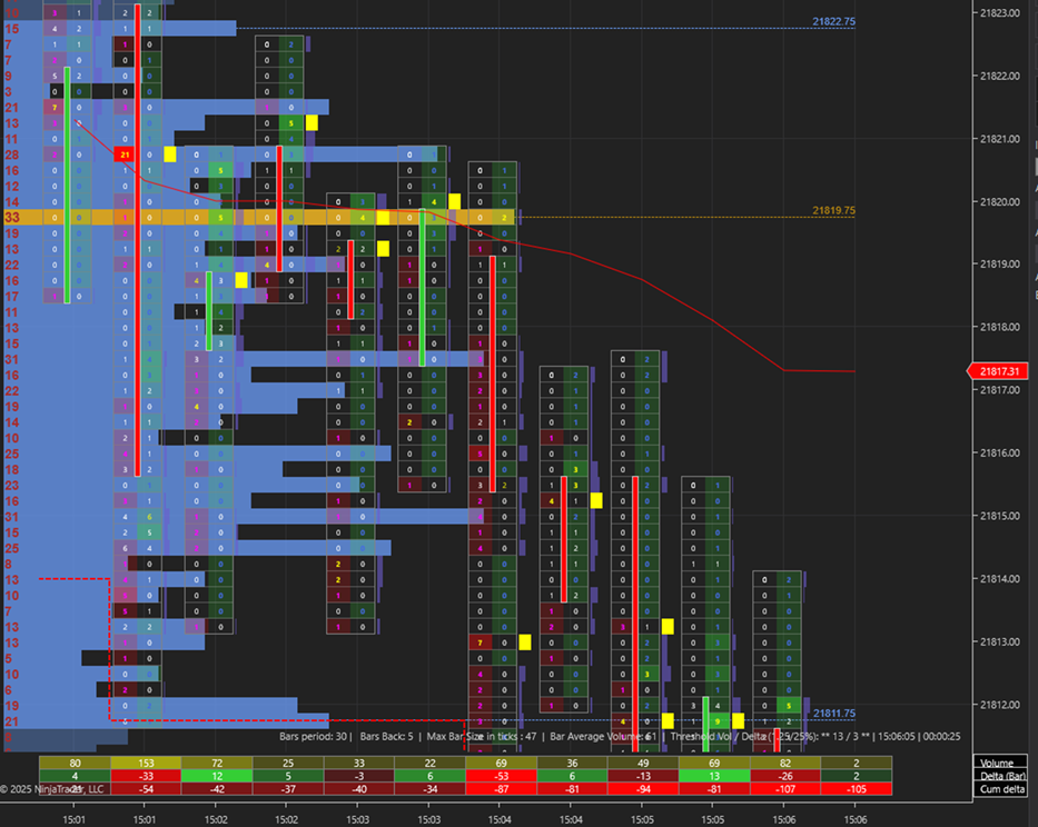 I am writing a strategy that utilizes value area high/low as shown in the NJ8 Order Flow Volume Profile indicator, but am having difficulty. Utilizing volumetric bars, I am starting at the POC, and incrementing up or down depending on which volume "bar" has the higher volume, adding that bar's volume to the total value area volume until I hit the threshold (using 0.68 of total volume, the default for the indicator). Ties favor the higher price. This works pretty good most of the time, but there are variations from what the NJ8 Order Flow Volume Profile indicator says. The issue seems to be that there are times when NJ8 goes past a small volume bar, see attachment "Order flow volume profile value area 1". You will see that four bars from the value area high there is a volume of 3, and there are no other bars with 3 or less below it in the value area, therefore there is some logic that NJ8 is using to go higher up the price ladder. Can anyone help me with this logic? I have also attached a screenshot of the entire session for context. This is using playback data, NQ MAR25, 2/9 - 2/10/2025, at 3:06:05pm PST. Thank you for any help you can provide.Tags: None
