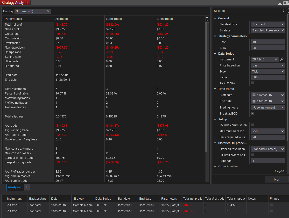 pic was two runs with the SampleMACrossOver strategy. "total slippage" shows as 0.34375 points (0.34375/0.03125 = 11 so the analyzer applied slippage to 11 of the 12 orders). given ZB has a $1000 point value, difference between "total net profit" should be $343.75. it is not, it is $218.75.