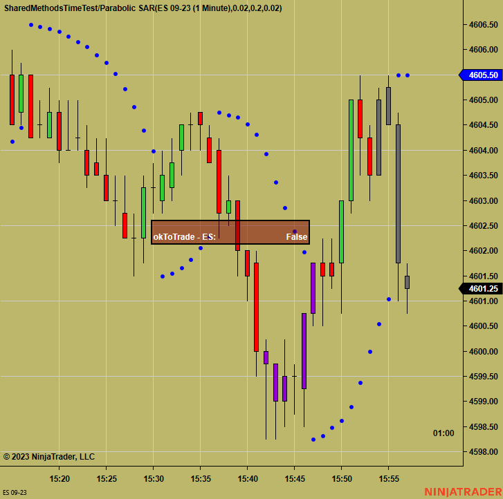 Please see the attached screenshot and scripts for demonstrating my question. I'm trying to understand the sample addons you provided but with a previously created NT7 "UserDefinedMethods" template file I had used successfully. For some reason,(on a different complex code) the bar coloring was shifted by 8 or 10 minutes. Please let me know if you see any offending or possible reason for this anomaly.