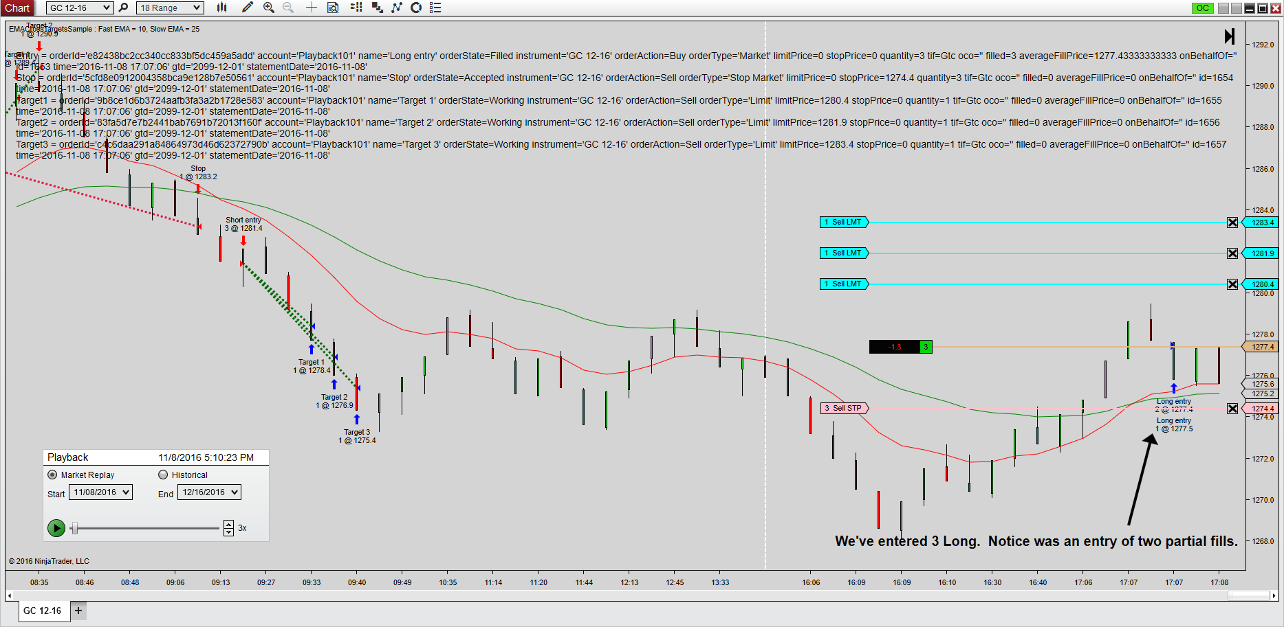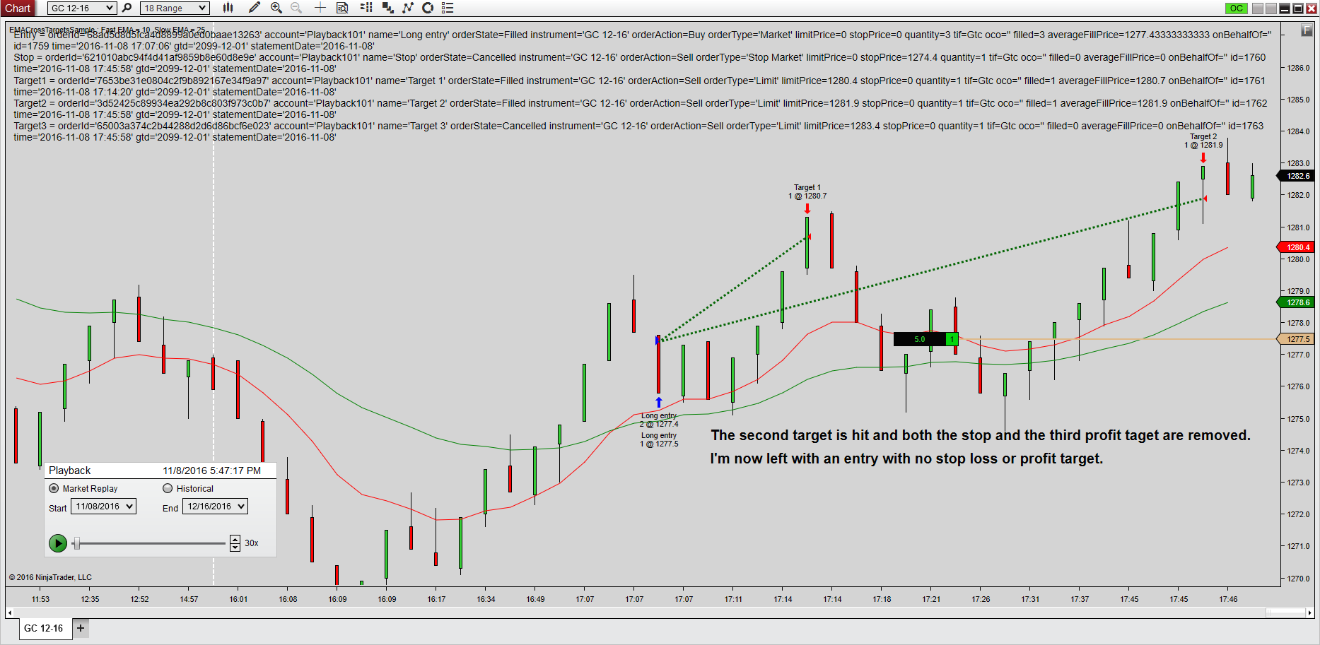 I've labored over this all day and all weekend and can't for the life of me figure out where I've gone wrong. This isn't the strategy that I've been working on. It's a pared down version of the EMA cross over that does the same thing. Namely, it enters a quantity of three and puts profit targets at three places and a stop loss. If all three quantities get filled in the same execution, all is well. The stop is adjusted properly when each target is hit and the order handles are nulled out when the third target is hit. However, if the entry is split into two partial fills, either 1 on the first entry and 2 on the second ( 3 total) or vice versa, then when the first or second target is hit, my stop loss and my profit target are both deleted. Boom. Gone. Just like that and I'm left with an outstanding order with no profit target or stop loss. I've attached a series of screen shots that show what's happening and the strategy where you can reproduce this at will on any instrument. You just need to wait until you get partial fills on the entry and it will do it for you on the targets. It stops you out just fine - it's just the targets that have a problem.