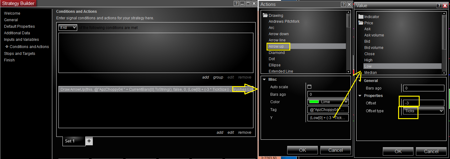 1) How to select the Low[0] price of the bar and subtract 3 ticks below that as the vertical location to draw the up arrow.