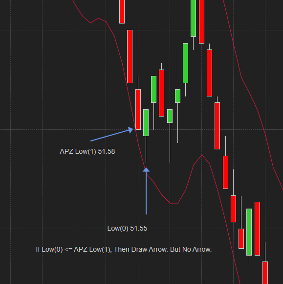 If the current price low (update on price change) drops lower than the lower APZ line of the prior bar (which already completed), then place an Arrow at this bar that is developing. I used place long order but it didn't do anything either.