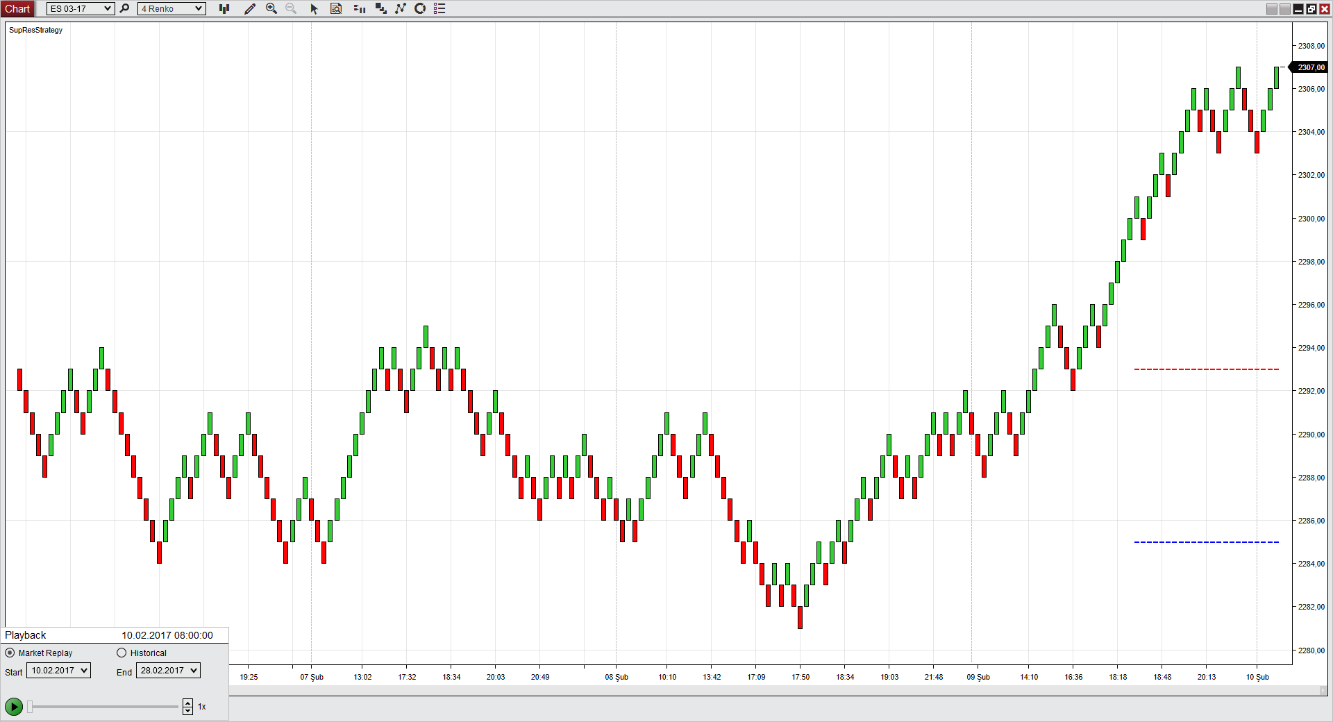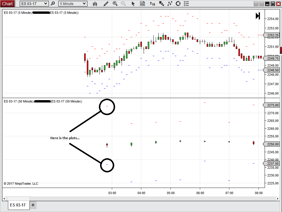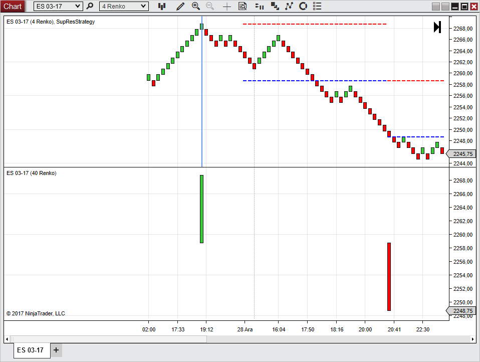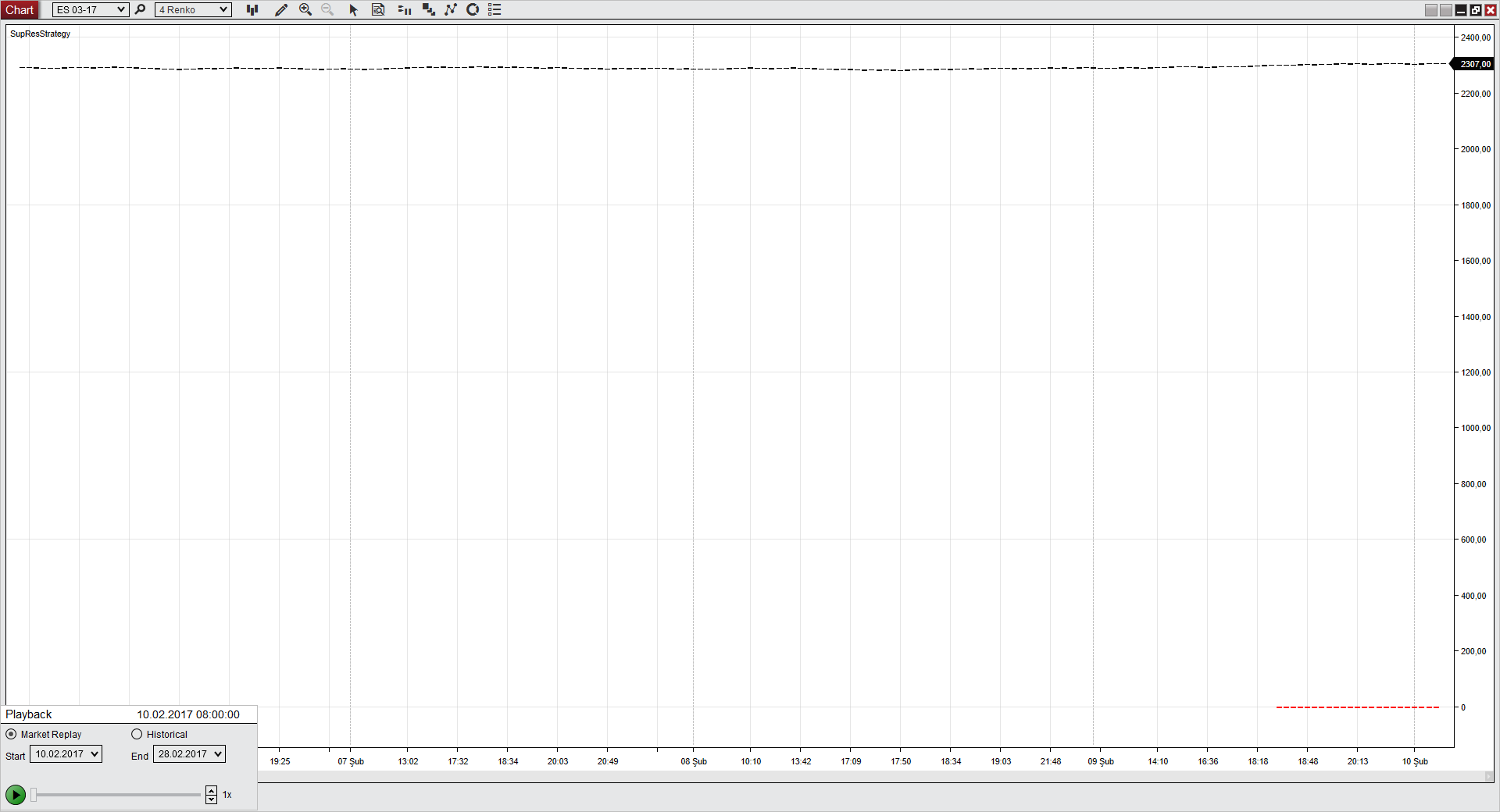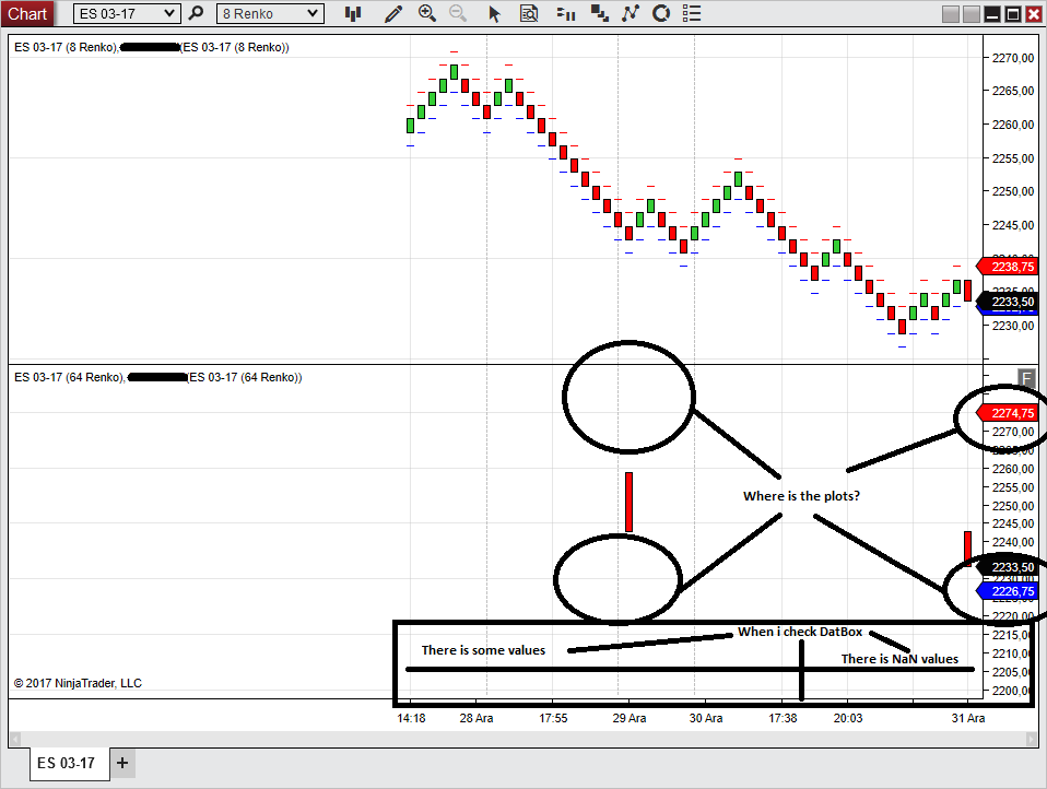 3. Connect to market replay and open a chart for X instruments X TimePeriod. I used "ES 03-17" and 4 ticks renko chart. So our secondary data will be "ES 03-17" and 40 ticks renko. You will see these is NaN and -0- plots on a chart. Warning!!! you have to load data on a chart below 20 bar number for higher time frame for see the problem. It does not matter market replay is at first available date or working or not.