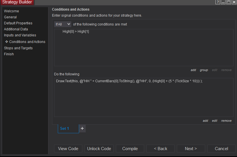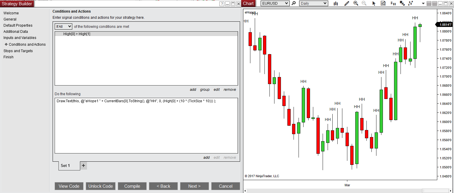 "if the current bar's High is Higher than the previous bar's High, then draw 'HH' above the current bar".