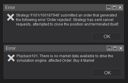 The errors you are reporting are from the Playback Connection not having enough historical data to fill an order.