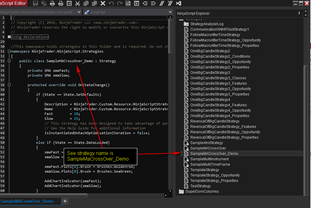 • Change file name: SampleMACrossOver_Demo.cs (also removes initial @)