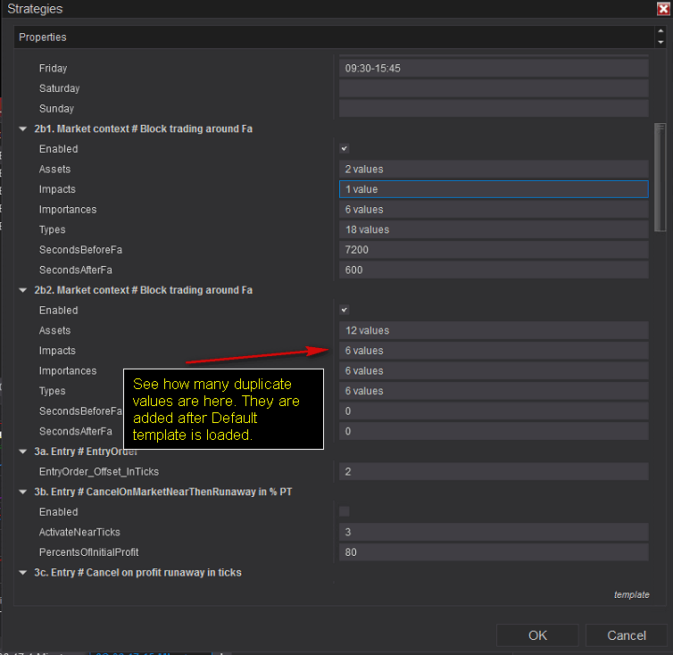 when loading and aplying strategy template, it adds up items from template to existing values, which causes strange behavior, where count of values in collection doubles = there are the old values + new ones from template.