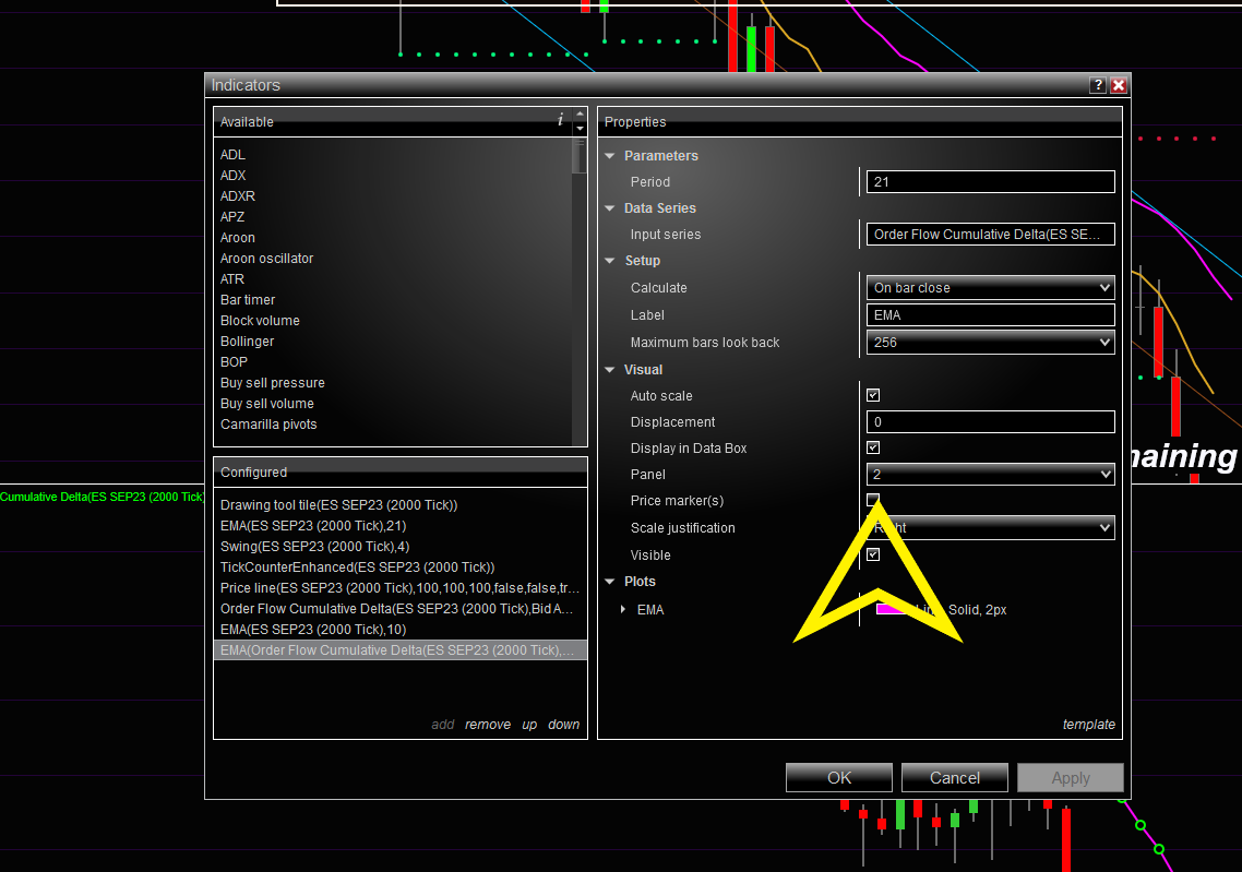 How to add a EMA to indicator Orderflow cumulative delta or a EMA to any indicator .